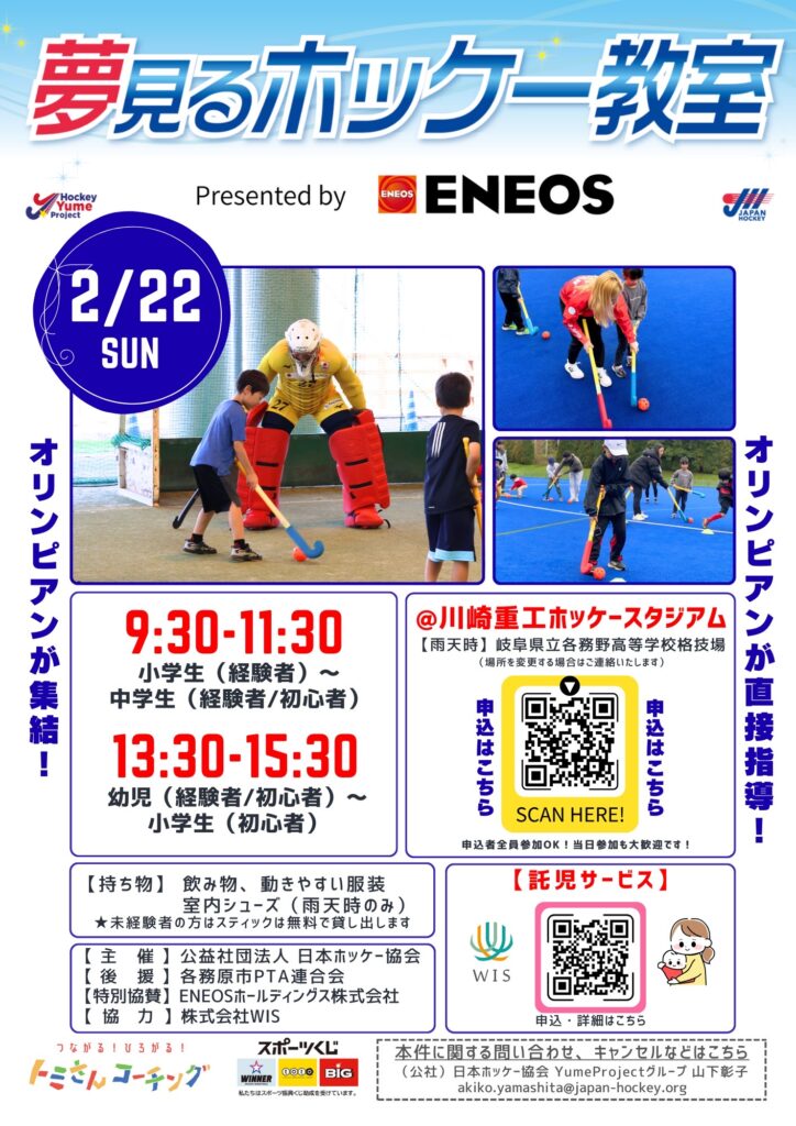 2月22日 (日) 川崎重工ホッケースタジアム (Aコート) にて、幼児~小学生・中学生 (未経験者・初心者・経験者)を対象に、「夢見るホッケー教室」を開催します。※託児サービスあり【雨天の場合は『岐阜県立各務野高等学校格技場』にて行ないます。】